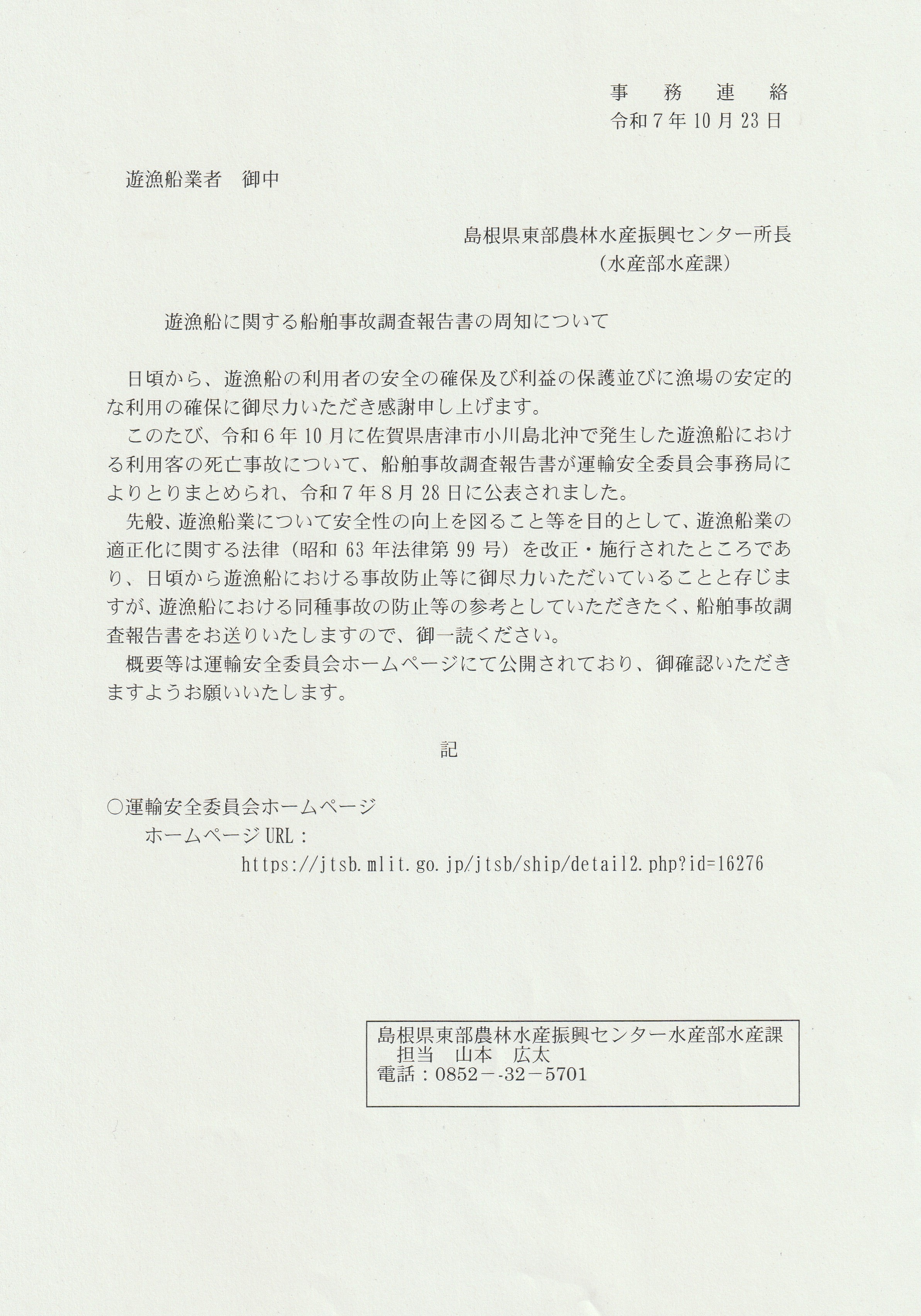 遊漁船に関する船舶事故調査報告書の周知について